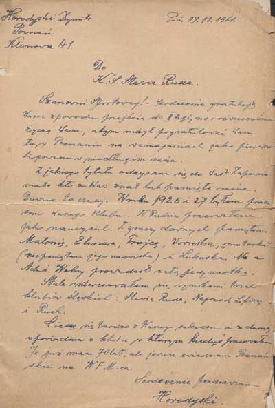 Pismo Dymitra Horodyskiego z gratulacjami dla KS Slavia